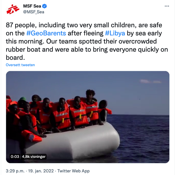– 87 mennesker, deriblant to småbarn, er i sikkerhet på GeoBarents etter å ha flyktet til havs fra Libya, skriver organisasjonen på Twitter onsdag.