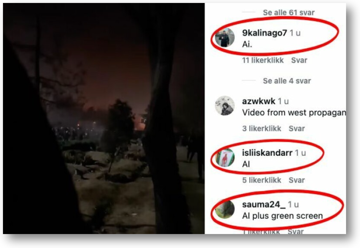 I kommentarfeltene er det en rekke profiler som påstår at videoen er falsk og KI-generert.